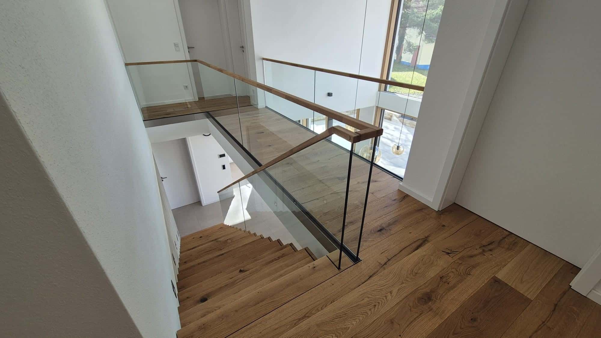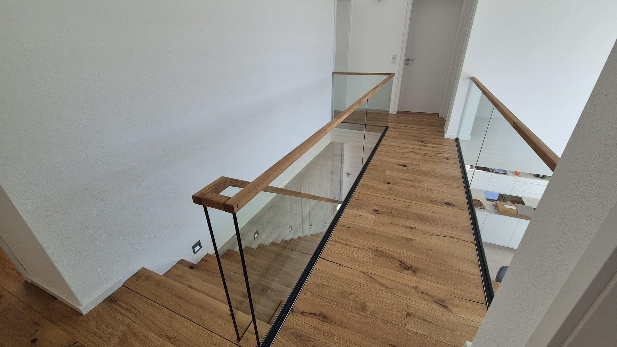 Ganzglasgeländer, Stahlrelinggeländer, Harfenkonstruktionen oder Glaswalls, um die gängigsten zu nennen. Auch von der Materialauswahl passen wir uns ganz Ihrem Interior an. Massivhölzer wie Buche, Eiche, Esche, Ahorn, Kirsche, Nussbaum oder andere exklusive Hölzer bieten wir gerne an. Weiter bieten wir Ihnen den Service der Farbölanpassung. Durch modernste Leinöle können wir unsere Stufen an Ihren Parkettboden anpassen.